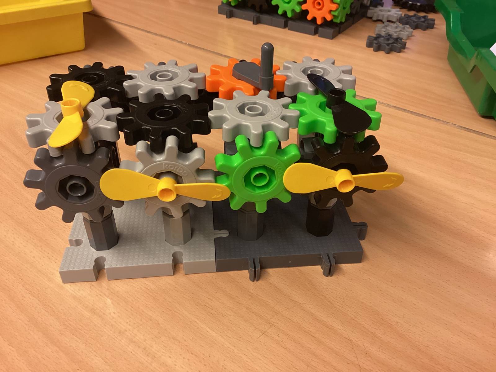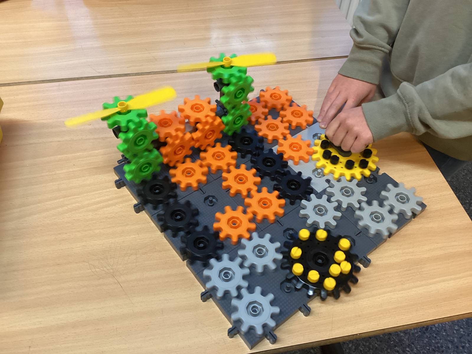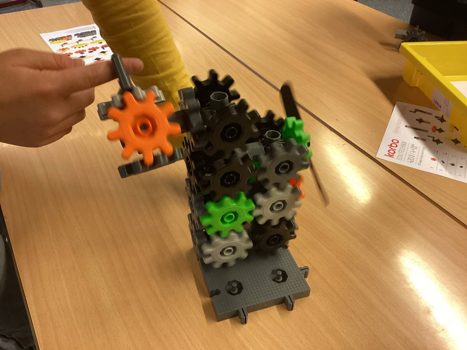 Bei der Fordermaßnahme Denksport setzen die Kinder Bauwerke und Konstruktionen mit Zahnrädern um.