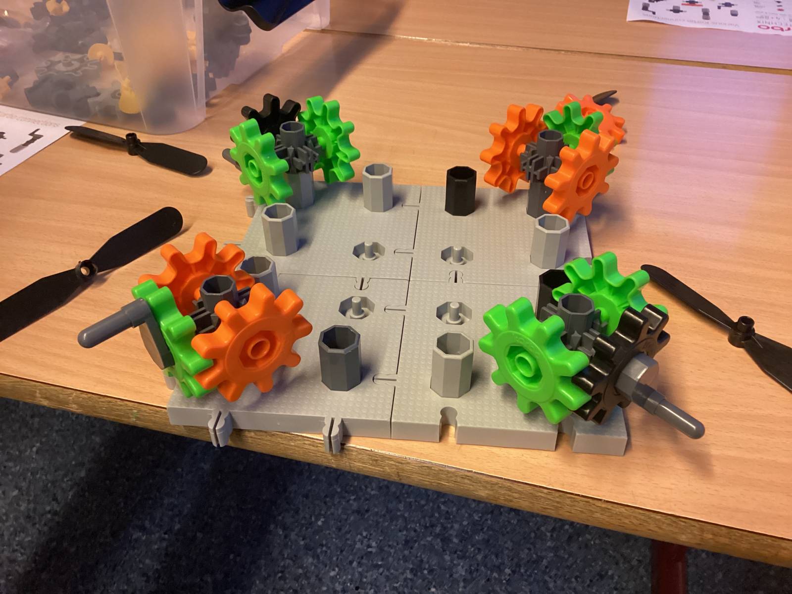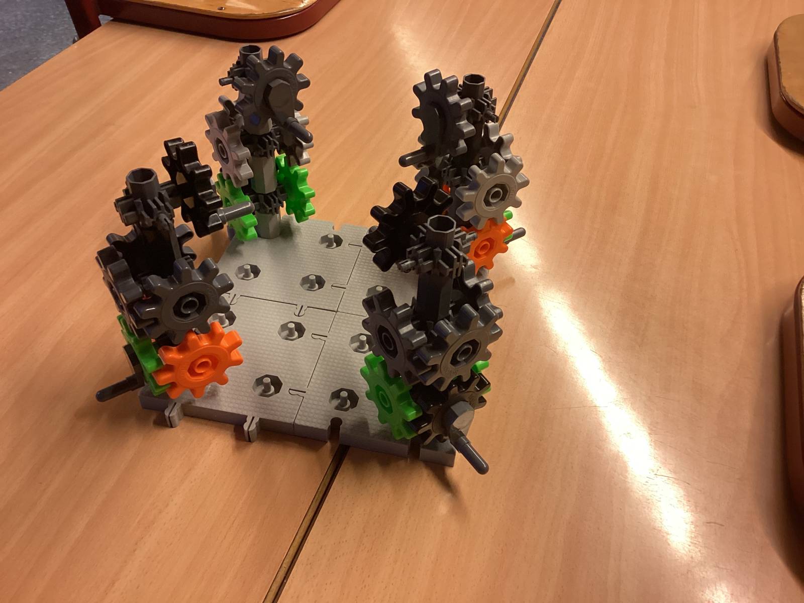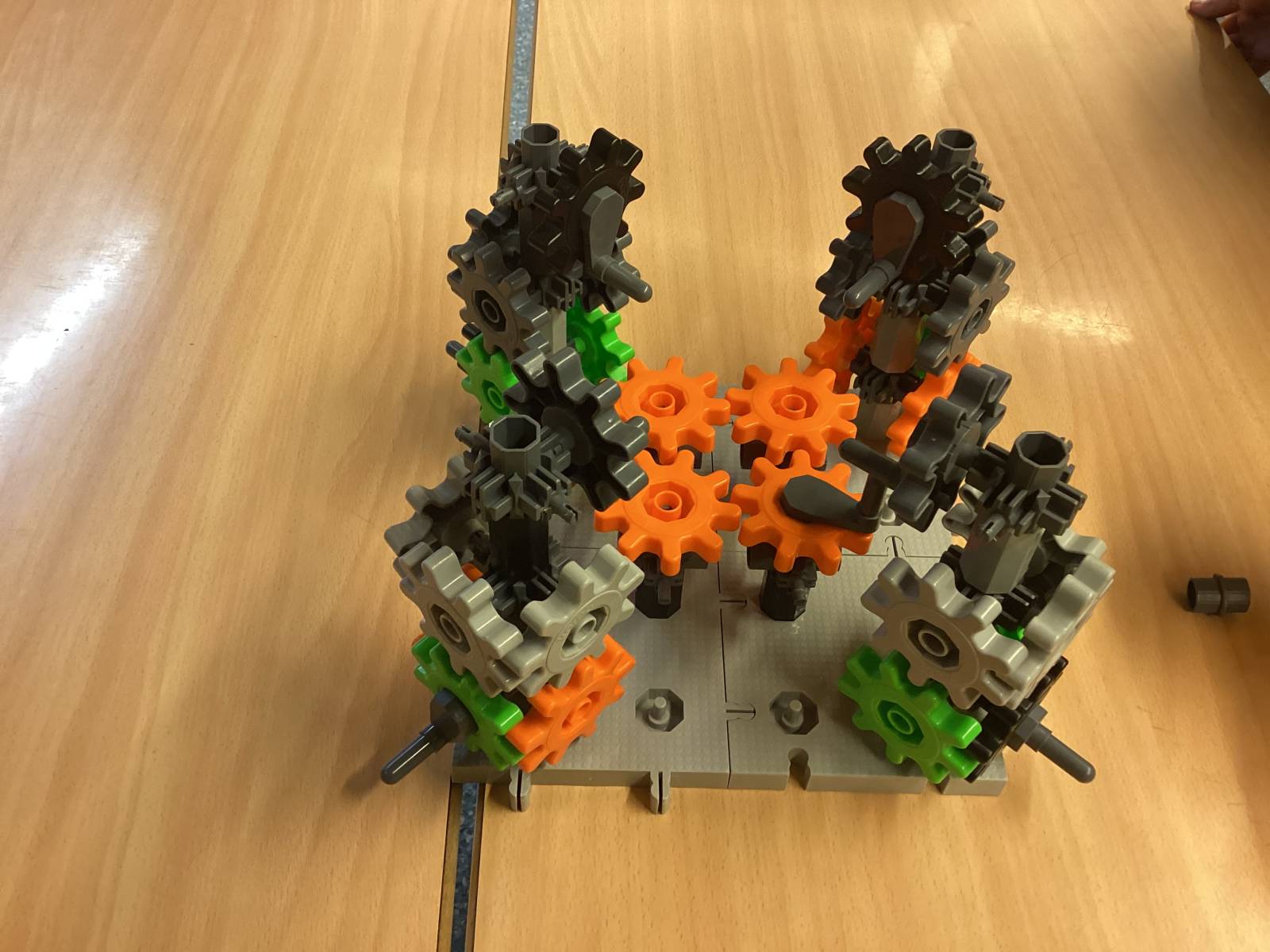 Bei der Fordermaßnahme Denksport setzen die Kinder Bauwerke und Konstruktionen mit Zahnrädern um.