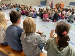 Nach Schulschluss haben sich alle Schüler:innen gemeinsam mit den Erziehungsberechtigten, den Geschwistern und den Lehrer:innen in der Sporthalle versammelt und das Eingeübte erfolgreich präsentiert.
